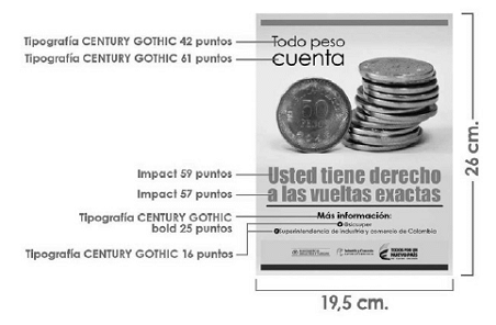 El consumidor tiene derecho a recibir información permanente sobre la disponibilidad de “vueltas” correctas. Con tal propósito, los establecimientos de comercio abiertos al público deberán colocar en la zona de cajas registradoras, por lo menos un letrero por cada tres (3) registradoras o fracción, que pueda ser leído a simple vista y sin dificultad desde cualquiera de ellas, con las dimensiones, colores, tipo de letra y diseño señalado en el anexo número 2 de la presente Circular.