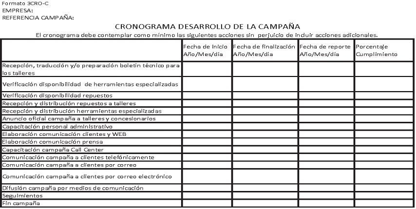 El formato “Remisión Campaña de Seguridad Vehículos” tiene por objeto fijar el mínimo de información que debe contener el reporte de la Campaña de Seguridad, en el cual se debe especificar la falla, línea y modelo del vehículo involucrado, número de unidades en circulación, cronograma de aplicación, entre otros;