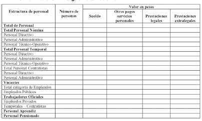 Vacantes: Hace referencia al número de vacantes del personal de nómina. Se aclara que debe diligenciarse el número de personas, ya que no se generan erogaciones por los demás conceptos. La información de sueldo, otros pagos servicios personales, prestaciones legales y prestaciones extralegales no son de carácter obligatorio.