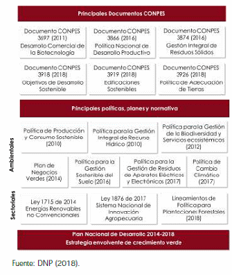 Colombia cuenta con un robusto marco político y normativo con el cual se busca reducir los impactos ambientales de las actividades productivas que soportan el desarrollo económico. El país ha realizado un esfuerzo para armonizar el desarrollo y el crecimiento de la economía con la protección de los recursos naturales, sin embargo, los sectores aún son intensivos en el uso de los recursos y han generado impactos en el capital natural, que inciden tanto en su oferta como en su calidad (DNP, Fedesarrollo, GGGI y PNUMA, 2017).