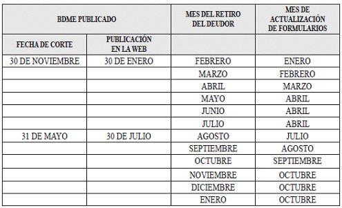 ARTÍCULO 3o. PLAZOS PARA EL REPORTE. Para el ingreso de deudores, la categoría BDME debe ser reportada, dentro de los diez (10) primeros días calendario de los meses de junio y diciembre de cada año, para las fechas de corte a 31 de mayo y 30 de noviembre respectivamente.