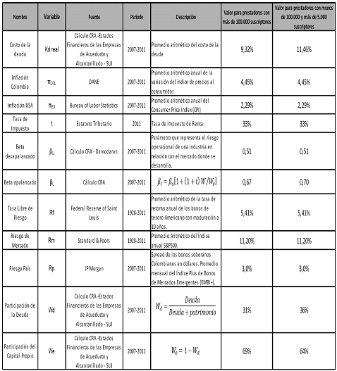 Las variables que se utilizan en el cálculo de la tasa de descuento son: