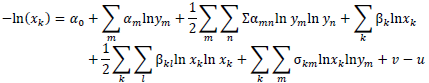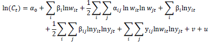 | u: | Término de error asimétrico no negativo (distribución normal truncada) para incluir ineficiencia técnica. |