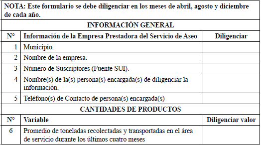 Fuente de información: La CRA utilizará mensualmente la información del formulario del presente anexo que será diligenciado mensualmente por los prestadores de servicios de aseo.