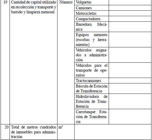 | Incluye: volquetas, camiones, motocicletas, compactadores, barredora mecánica, equipos menores, vehículos asignados a administración, vehículos para el transporte de operarios, tractocamiones, báscula de estación de transferencia, hidrolavadora de estación de transferencia y carrotanque estación de transferencia. | |