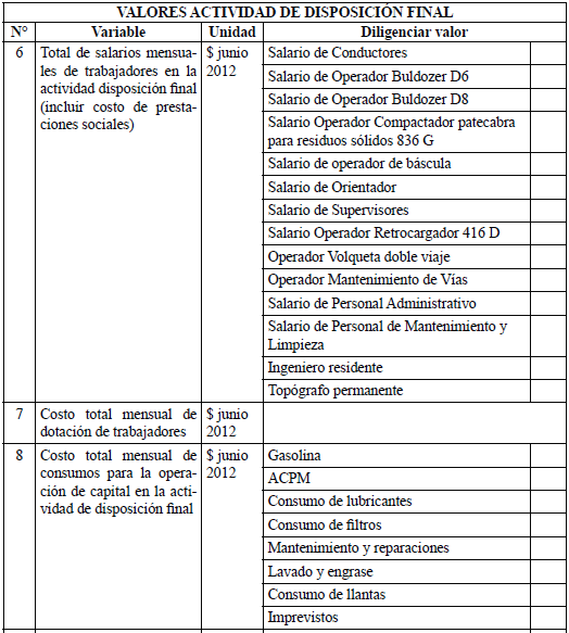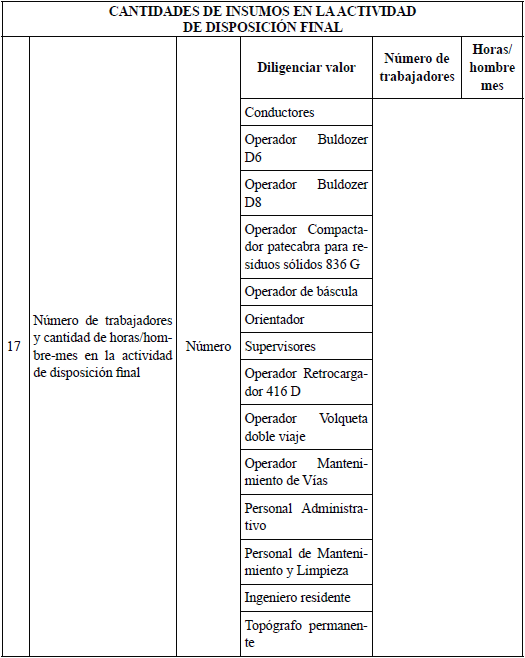 | Precios unitarios de los insumos | Incluye: conductores, operador buldozer D6, operador buldozer D8, operador compactador patecabra para residuos sólidos 836 G, orientador, supervisores, operador de báscula, operador retrocargador 416 D, operador volqueta doble viaje, operador mantenimiento de vías, personal administrativo, personal de mantenimiento y limpieza, ingeniero residente y topógrafo permanente. |