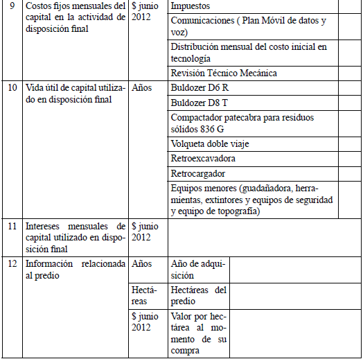 | w8: Costos fijos mensuales del capital en la actividad de disposición final. | |