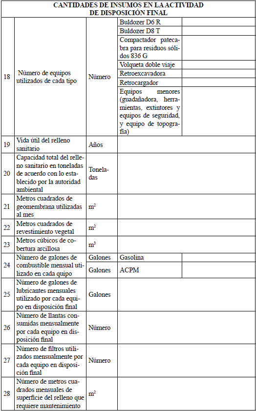 | Medición de las cantidades de insumos diferentes a trabajo que son utilizados para prestar los servicios de recolección y transporte, barrido y limpieza y disposición final. | Incluye: volquetas, camiones, motocicletas, compactadores, barredora mecánica, equipos menores, vehículos asignados a administración, vehículos para el transporte de operarios, tractocamiones, báscula de estación de transferencia, hidrolavadora de estación de transferencia y carrotanque estación de transferencia. |