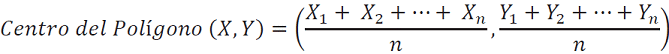 2. Calcular el centro del polígono que forma el área de confluencia, para lo cual se deben determinar las coordenadas (X, Y) de diferentes puntos que delimiten el polígono y reemplazarlos en la siguiente fórmula, la cual permitirá promediar y hallar las coordenadas de dicho centro.