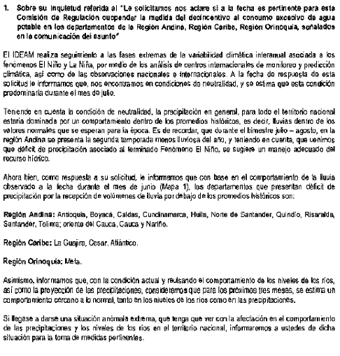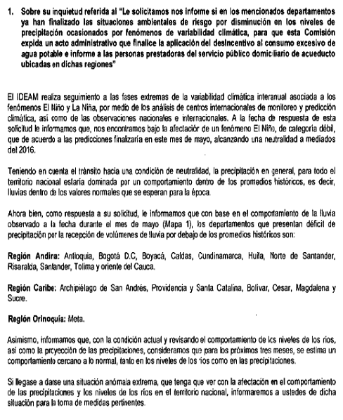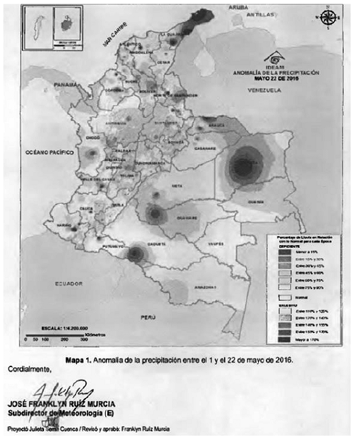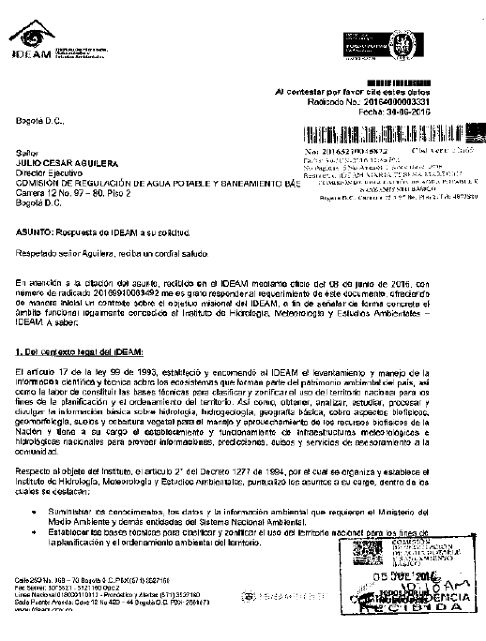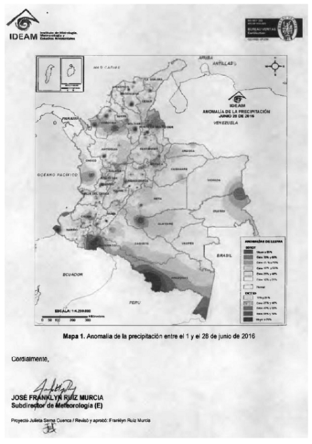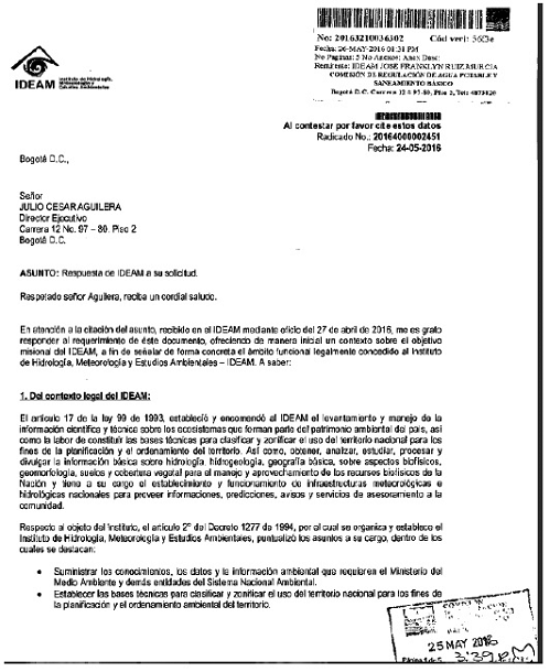 Que mediante comunicaciones con radicados CRA 2016-321-003630-2 de 26 de mayo de 2016, y CRA 2016-321-004587-2 de 30 de junio de 2016, las cuales hacen parte de la presente resolución como anexos, el Subdirector de Meteorología del Instituto de Hidrología, Meteorología y Estudios Ambientales (Ideam) informó a esta Comisión de regulación, que: