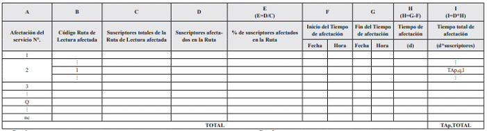 | TAp,q,l: | Tiempo de afectación en la ruta de lectura l perteneciente a la afectación número q, que se presentó durante el mes p. Este parámetro se obtiene de multiplicar el número de suscriptores afectados en cada ruta de lectura (Columna D en la tabla) por el tiempo que duró la afectación en días (Columna H en la tabla). |