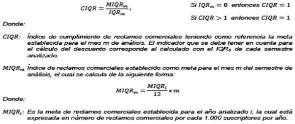 “Artículo 92. Indicador de Reclamos Comerciales (IQR y CIQR). Este indicador medirá el número de reclamos comerciales por exactitud en la facturación, resueltos a favor del suscriptor en segunda instancia, por cada 1.000 suscriptores durante el periodo de evaluación analizado. La expresión para determinar mensualmente este indicador es la siguiente: