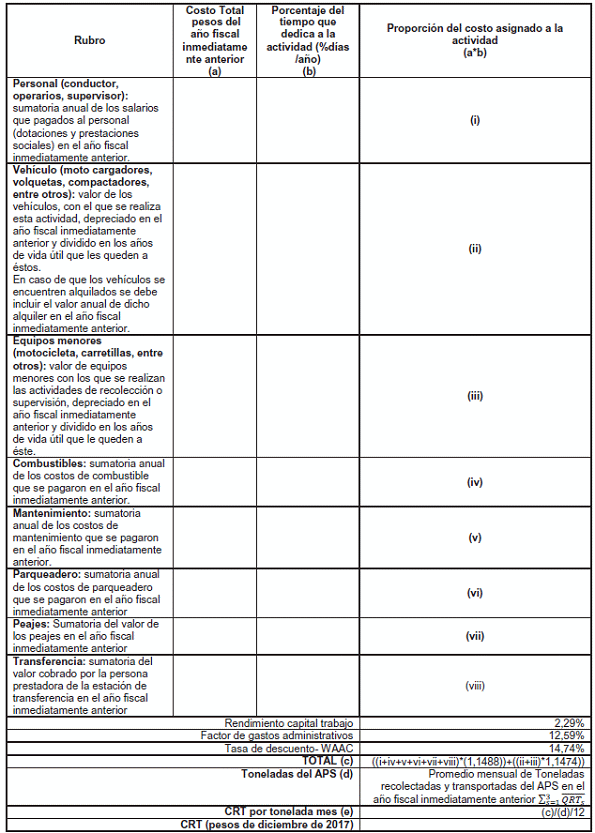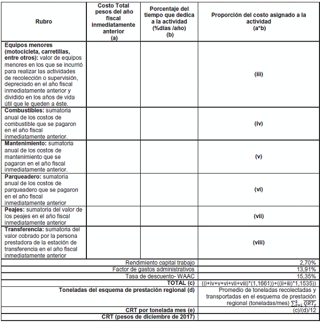 Se debe considerar que para el cálculo de CRT, la persona prestadora de Recolección y Transporte de residuos sólidos no aprovechables que dispone residuos sólidos en un relleno sanitario que no cuenta con báscula de pesaje, deberá reemplazar la variable