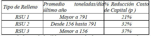 Costo de Disposición Final con Aporte Bajo Condición (CDFABC). Cuando el valor total de los activos es aportado por una entidad pública, la proporción de costo de capital en que se reduciría el costo total por tonelada para el CDF es el siguiente, de acuerdo al tamaño del relleno sanitario: