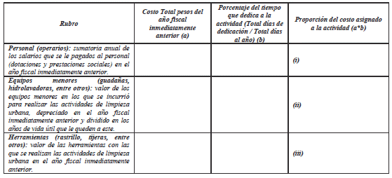 . Del mismo modo, en el cálculo del precio mínimo en el literal b, perteneciente al mismo artículo, se indica que el Costo de Barrido y Limpieza de vías y áreas públicas y Limpieza Urbana será el resultado de la aplicación de los rubros de la tabla; no obstante, en las últimas dos filas, se hace necesario ajustar la mención a la variable