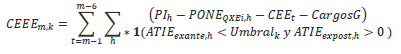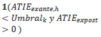 ![]() | Función indicadora que toma un valor de 1 si se observa un error de exclusión. Este error aparece cuando no se activa la TIE ex ante, es decir, es menor al umbral k, pero al calcular la relación de activación de la TIE ex post se encuentra que es mayor que 0. |