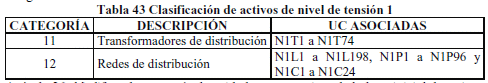 | Categoría de activos, l toma los valores de 11 o 12 para el nivel de tensión 1 y de 1 a 10 para los demás niveles de tensión. | |