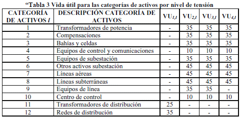 ARTÍCULO 6o. MODIFICAR LA VIDA ÚTIL POR CATEGORÍA DE ACTIVOS. Modifíquese la Tabla 3 del numeral 3.2.4 del anexo general de la Resolución número CREG 015 de 2018, la cual quedará así: