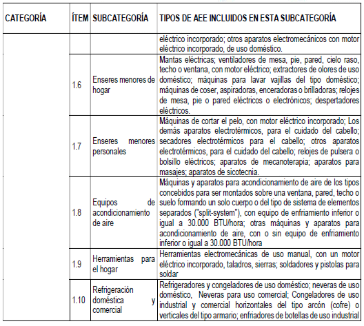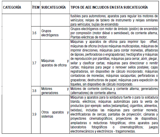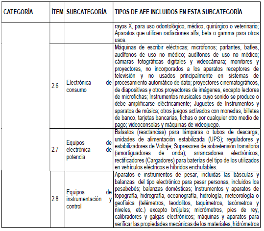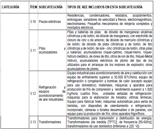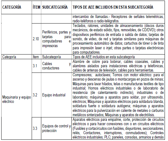 1. El conjunto de AEE relacionado en la tabla es provisional. Debe ser empleado como referencia en tanto Minambiente define oficialmente la lista de AEE para efectos de la gestión de sus residuos.