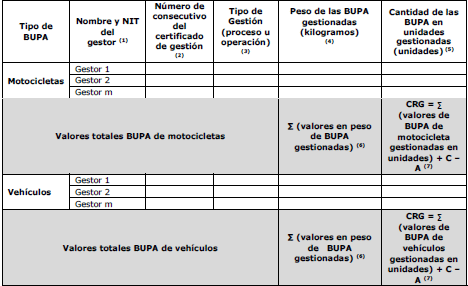 (7) Corresponde al cálculo del CRG = Cantidad en unidades de BUPA recolectadas y gestionadas de motocicletas o de vehículos, el cual es igual a la suma que totaliza los valores de las cantidades de las BUPA en unidades sumado a la cantidad de las BUPA en unidades ajustada (valor C de la tabla 1A) y restando la cantidad de las BUPA en unidades (valor A de la tabla 1A).