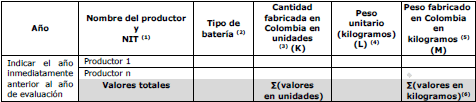 Tabla 2. Cantidad de baterías plomo ácido (motocicleta o vehículo) (1) introducidas o puestas en el mercado (CPM)