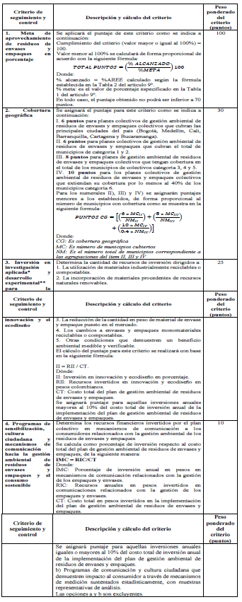 ARTÍCULO 10. METODOLOGÍA MULTICRITERIO DE EVALUACIÓN DEL CUMPLIMIENTO DEL PLAN DE GESTIÓN AMBIENTAL DE RESIDUOS DE ENVASES Y EMPAQUES. La metodología multicriterio se aplicará únicamente para planes colectivos de gestión ambiental de residuos de envases y empaques conforme a lo dispuesto en el presente artículo.