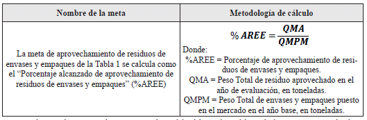 Tabla. 2 Fòrmula para el càlculo de la meta de aprovechamiento de residuos de envases y empaques