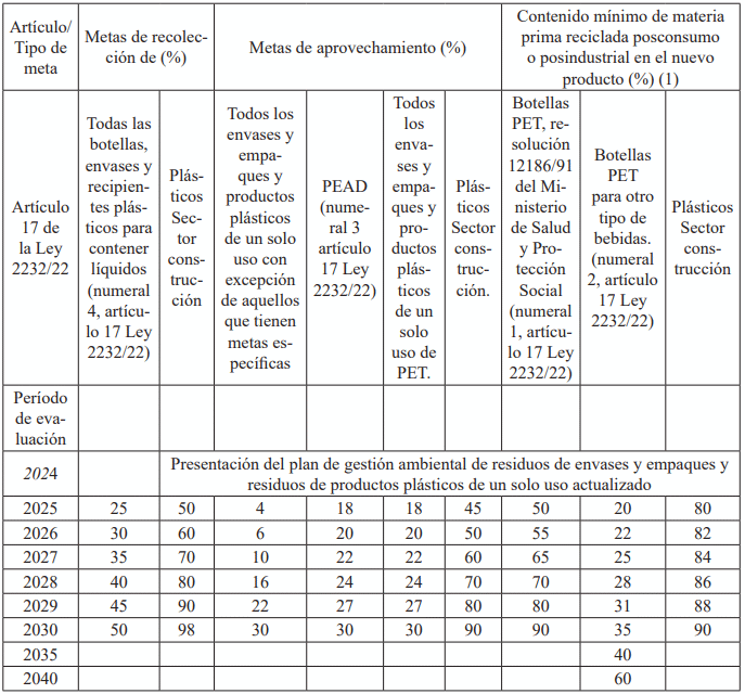Tabla 1 -a. Metas de cuantitativas de recolección, aprovechamiento y contenido de materia prima reciclada en el nuevo producto, para residuos de envases y empaques plásticos y residuos de productos plásticos de un solo uso.