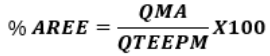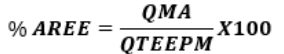 | La meta de aprovechamiento de residuos de botellas, envases y recipientes para contener líquidos de PEAD | Donde: %AREE = Porcentaje de aprovechamiento de residuos de envases y recipientes para contener líquidos de PEADQMA = Peso Total de residuo aprovechado de PEAD en el año de evaluación, en toneladas. QTEEPM = Peso Total de botellas, envases y recipientes para contener líquidos, elaborados con PEAD puestos en el mercado en el año base, en toneladas. |