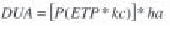 DUA = Demanda de Agua para Uso Agrícola, la principal fuente de agua para la agricultura es la precipitación, los volúmenes adicionales necesarios para el desarrollo de cultivos, deben ser previstos por sistemas de riego. Cuando la precipitación es menor que el uso consuntivo de un cultivo (ETP*kc)2 el agua debe ser suministrada a través de sistemas de riego.