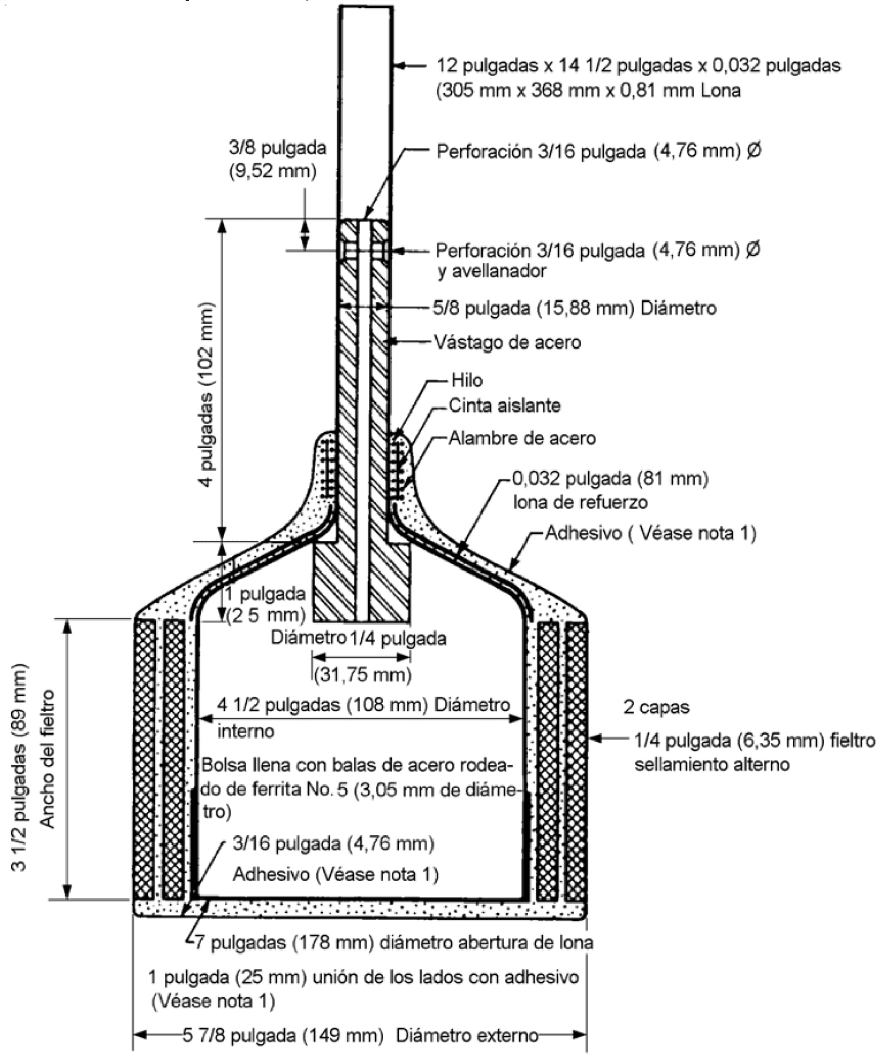 Los bordes del espécimen se apoyan en una posición horizontal, empleando un marco de acero fabricado como se ilustra en la Figura 1. La temperatura del espécimen debe estar entre -23oC y -12oC (-10oF a + 10oF). El ensayo de impacto de esfera consiste en dejar caer una esfera de acero de 2,254 a 2,282 kg (5 libras ± 0.5 oz), desde una altura de 6,10 m (20 pies) sobre el espécimen de ensayo, dentro de un área de 25 mm (1 pulgada) de su centro. Si las capas de vidrio no se rompen al primer impacto de la esfera, el espécimen se voltea y se repite el mismo ensayo en la superficie opuesta. En caso de laminados asimétricos con sólo una superficie exterior de vidrio, el espécimen debe recibir un impacto en cada superficie, empezando con la de vidrio. En caso de laminados que no tengan superficies exteriores de vidrio, el espécimen debe recibir un impacto en cada superficie. Cualquier impacto que no ocurra dentro del área de 1 pulgada del centro del ensamble, se debe descartar y realizar el ensayo en otra muestra. Se deben ensayar 2 especímenes de 305 x 305 mm (12 x 12 pulgadas).