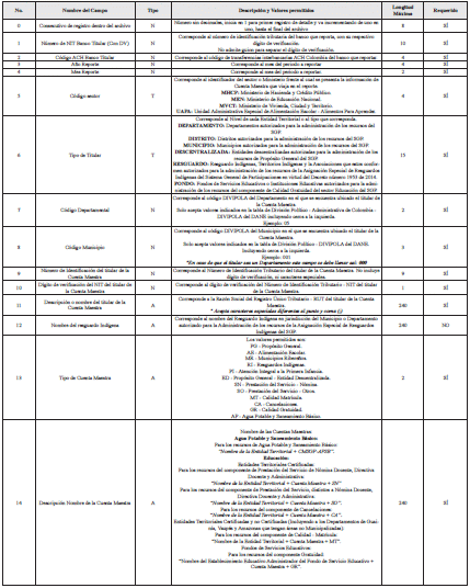 | 6 | Tipo Titular | T | Corresponde al Nivel Territorial de cada Entidad Territorial o al tipo de titular que corresponda. DEPARTAMENTO: Departamentos autorizados para la administración de los recursos del SGP. DISTRITO: Distritos autorizados para la administración de los recursos del SGP. MUNICIPIO: Municipios autorizados para la administración de los recursos del SGP. DESCENTRALIZADA: Entidades Descentralizadas autorizadas para la administración de los recursos de Propósito General del SGP. RESGUARDO: Resguardos Indígenas, Territorios Indígenas y las Asociaciones que estos conformen-autorizados para la administración de los recursos de la Asignación Especial de Resguardos Indígenas del Sistema General de Participaciones en virtud del Decreto número 1953 de 2014. FONDO: Fondos de Servicios Educativos o Instituciones Educativas autorizados para la administración de los recursos del componente de Calidad Gratuidad del sector Educación del SGP. | 15 | SÍ |