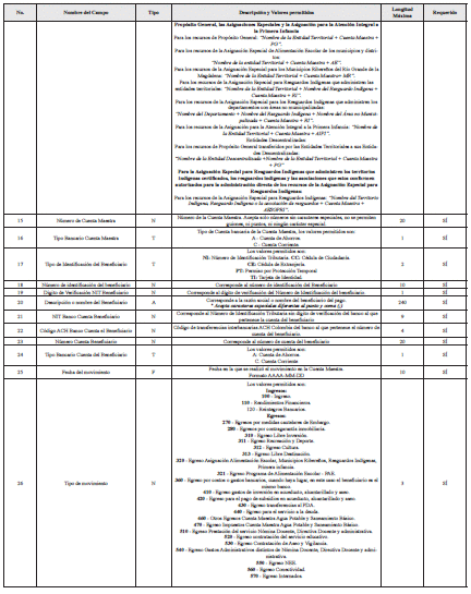 | 14 | Nomenclatura Cuenta Maestra para Pagos Electrónicos | A | Nombre de la Cuenta Maestra: Agua Potable y Saneamiento Básico: Para los recursos de la Participación de Agua Potable y Saneamiento Básico: “Nombre de la Entidad Territorial + Cuenta Maestra Pagadora + AB”. Educación: Entidades Territoriales Certificadas: Para los recursos del componente de Prestación del Servicio Nómina Docente, Directiva Docente y Administrativa: “Nombre de la Entidad Territorial Certificada + Cuenta Maestra Pagadora +PN”. Para los recursos del componente de Prestación del Servicio, distinto a Nómina Docente, Directiva Docente y Administrativa: “Nombre de la Entidad Territorial Certificada + Cuenta Maestra Pagadora + PE”. Para los recursos del componente de Cancelaciones: “Nombre de la Entidad Territorial Certificada + Cuenta Maestra Pagadora + CD”. Entidades Territoriales Certificadas y no Certificadas (Incluyendo a los Departamentos de Guainía, Vaupés y Amazonas que tengan áreas no municipalizadas): Para los recursos del componente de Calidad Matrícula: “Nombre de la Entidad Territorial + Cuenta Maestra Pagadora+ MA”. Fondos de Servicio Educativo: Para los recursos del componente de Calidad Gratuidad: “Nombre del Establecimiento Educativo Administrador del Fondo de Servicio Educativo + Cuenta Maestra Pagadora + CG” Participación de Propósito General, las Asignaciones Especiales y la Asignación para la Atención Integral a la Primera Infancia: Para los recursos de la Participación de Propósito General: “Nombre de la Entidad Territorial + Cuenta Maestra Pagadora + PP”. Para los recursos de la Asignación Especial de Alimentación Escolar: “Nombre de la Entidad Territorial + Cuenta Maestra Pagadora + LP”. Para los recursos de la Asignación Especial de Municipios Ribereños: “Nombre de la Entidad Territorial + Cuenta Maestra Pagadora + PR”. Para los recursos de la Asignación Especial de Resguardos Indígenas: “Nombre de la Entidad Territorial + Nombre del Resguardo Indígena + Cuenta Maestra Pagadora + RP”. Para los recursos de la Asignación Especial para los Resguardos Indígenas que administren los Departamentos con áreas no municipalizadas: “Nombre del Departamento + Nombre del Resguardo Indígena + Nombre del Área no Municipalizada + Cuenta Maestra + RP” | 240 | SÍ |