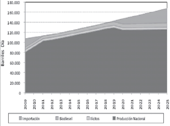 El gráfico muestra las proyecciones de biodiésel en una mezcla de 5%. Durante 2009 se demandan 5,411 barriles día de Biodiésel y en 2025 se requerirán 8,400 barriles por día, es decir un incremento del 55.1%.