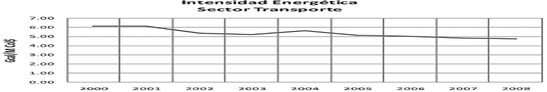 El gráfico siguiente muestra la evolución de la intensidad energética del sector transporte tanto en PIB con pesos de 1994 como en PIB con pesos de 2000. Se muestra una tendencia a la baja de este indicador de eficiencia. La intensidad energética del sector transporte es la de mayor valor en comparación con la de los otros sectores y del global nacional, ya que este sector es el mayor consumidor de energéticos, principalmente los derivados del petróleo y el PIB relacionado con este sector es uno de los más bajos del país.