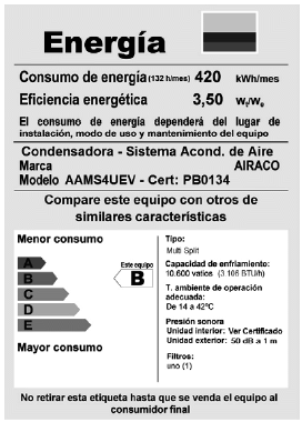 a) La denominación del tipo de equipo al cual corresponde la etiqueta, así: Condensadora - Acondicionador de Aire, si es para combinación uno a uno, o Condensadora - Sistema Acondicionador de Aire, si es Multisplit.
