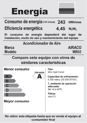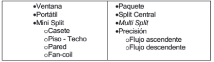 | 8415.10.10.00 8415.10.90.00 8415.82.20.00 8415.82.30.00 8415.82.40.00 | Máquinas y aparatos para acondicionamiento de aire que comprendan un ventilador con motor y los dispositivos adecuados para modificar la temperatura y la humedad, aunque no regulen separadamente el grado higrométrico. | Aplica a: Acondicionadores de aire con capacidades de enfriamiento inferiores a 10.540 W, alimentados con energía eléctrica. Acondicionadores de aire con capacidades de enfriamiento desde 10.540 W hasta 17.580 W, alimentados con energía eléctrica. Unidades Evaporadoras (interiores) y Condensadoras (exteriores) de los anteriores. Acondicionadores de aire tipo precisión hasta 17.580 W de capacidad de enfriamiento, incluidos o no en gabinetes o tableros. No aplica: Cuando se fabriquen o importen para incorporarlos como parte integral de automotores, navíos, aeronaves u otros aparatos, máquinas y herramientas. No aplica cuando estén diseñados exclusivamente para recintos en donde se alojen equipos especializados de electromedicina para prestación de servicios médicos o de cirugía. Acondicionadores de aire portátiles con capacidades de enfriamiento iguales o inferiores a 1.000 W. |