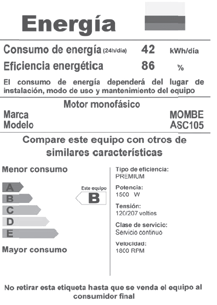 - Motores: No hay muestreo, cada equipo, deberá disponer de la información soporte, para el consumo y desempeño energético, etiquetada o a etiquetar, obtenida bajo responsabilidad del productor con base en resultados de ensayo a los modelos base y/o resultados de herramientas de diseño/simulación, propias del fabricante, el productor o de terceros.