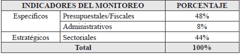 Artículo 6o. Ponderación de los indicadores específicos y estratégicos. La ponderación de los indicadores específicos y estratégicos para el ejercicio de la actividad de monitoreo a los municipios y distritos, será la siguiente: