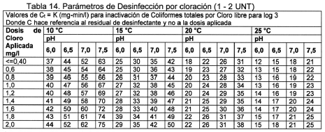 Si la operación de la PTAP permite del 90 al 95% de la remoción de coliformes totales en los procesos previos de sedimentación y filtración, y la turbiedad del agua filtrada está entre 1 y 2 UNT, debe usarse la Tabla 14 para determinar el valor de K en función de la temperatura del agua y su pH.