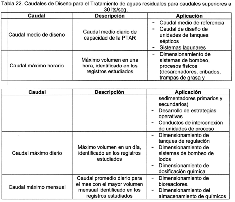 Para el dimensionamiento de las plantas de tratamiento de aguas residuales, para caudales superiores a 30 lts/seg y sistemas lagunares deberán tenerse en cuenta los caudales indicados en la Tabla 22.