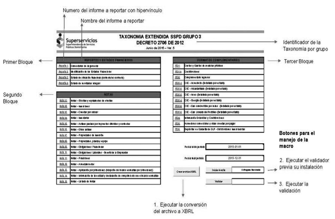 Para facilitar la conversión de la información en Excel al lenguaje XBRL, se puede hacer uso, a elección del PSPD, de la macro que la Superservicios ha dispuesto de forma temporal, para tal fin. Por lo tanto, los PSPD deben implementar los mecanismos necesarios para disponer de la información financiera en formato XBRL, en el momento que la macro sea retirada. En caso de optar por la no utilización de la macro, los PSPD deben utilizar las taxonomías para preparar su información financiera para el cargue en XBRL, como se indica en el “Instructivo para el cargue de información financiera preparada de conformidad con la Ley 1314 de 2009 y presentada en formato XBRL”, y de acuerdo con las estructuras publicadas en la página web del SUI.