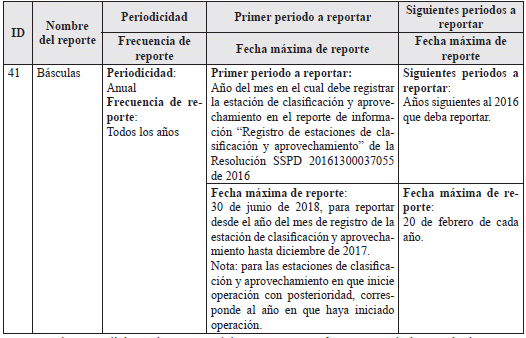 ARTICULO 16. Aclarar el texto del "Primer periodo a reportar" del numeral "41.Basculas", contenido en el cronograma de cargue de informacion del Anexo 1, de la Resolución SSPD 2017000237705 de 2017, modificado por la Resolucion SSPD 20184000018825 de 2018, el cual quedara asi:
