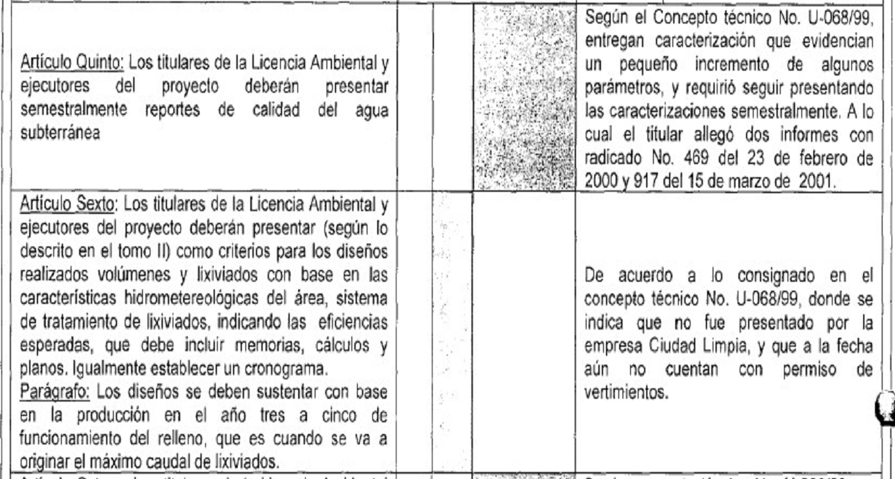 El titular de la licencia ambiental del relleno sanitario Parque Ambiental Pirgua esté cumpliendo todas las obligaciones previstas en el Plan de Manejo Ambiental para garantizar la prevención, corrección, mitigación y compensación de los impactos causados al recurso hídrico por la operación de esa infraestructura.