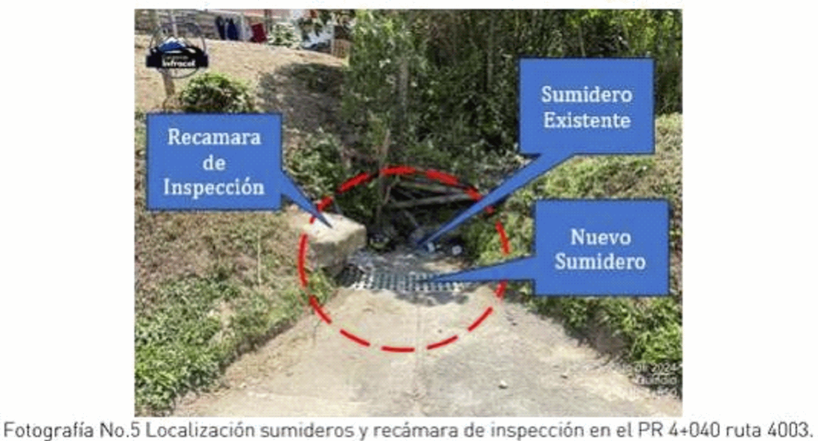 Luego de una visita técnica de personal INVIAS y EMCA al punto de criticidad, se definió la necesidad de ampliar la capacidad de evacuacon (sic) del sumidero existente (sic), por esa razón en el mes de agosto del presente año el Instituto Nacional de Vías a traves (sic) de su contratista Consorcio La Línea AL construyó un sumidero adicional en el PR04+040 de la ruta 4003, con una conexion (sic) a la recamara de inspección.