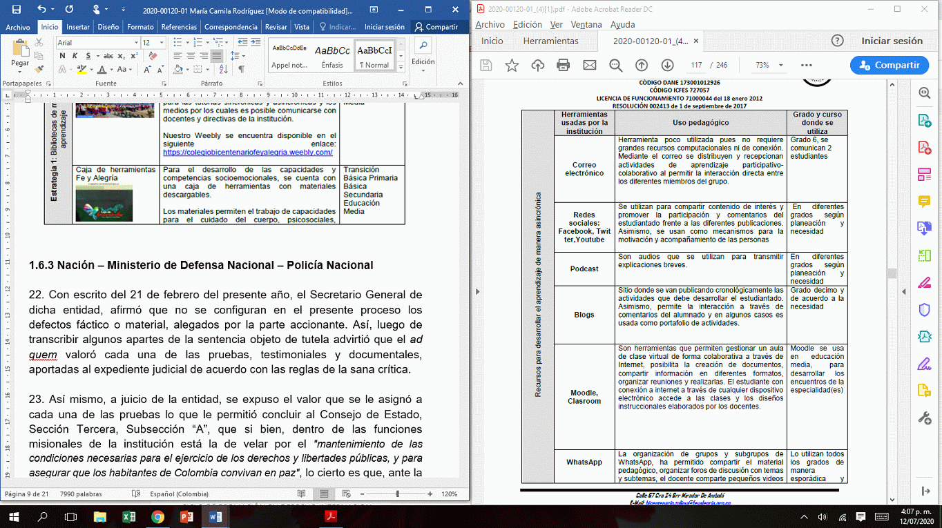99. De igual forma, la Institución Educativa Bicentenario Fe y Alegría afirmó que la estudiante ha venido recibiendo clases de manera continua, prueba de ello son el envío oportuno de las actividades académicas a través del número telefónico de WhatsApp de la señora María Camila Rodríguez Díaz así como el uso hasta el mes de mayo de la plataforma tecnológica Zoom. Afirmó que, si bien, no se ha vuelto a conectar en las clases sincrónicas, sí se advierte el envío de las tareas de forma asincrónica.