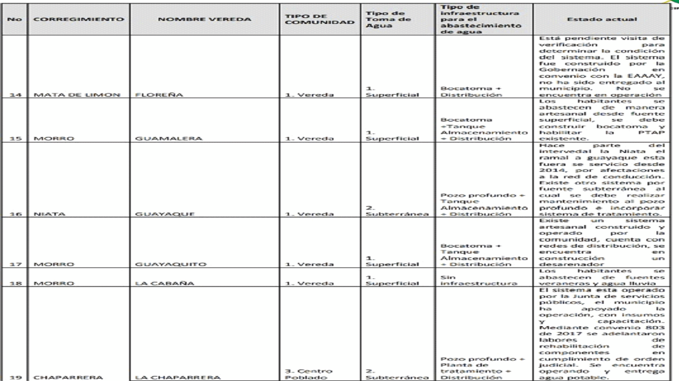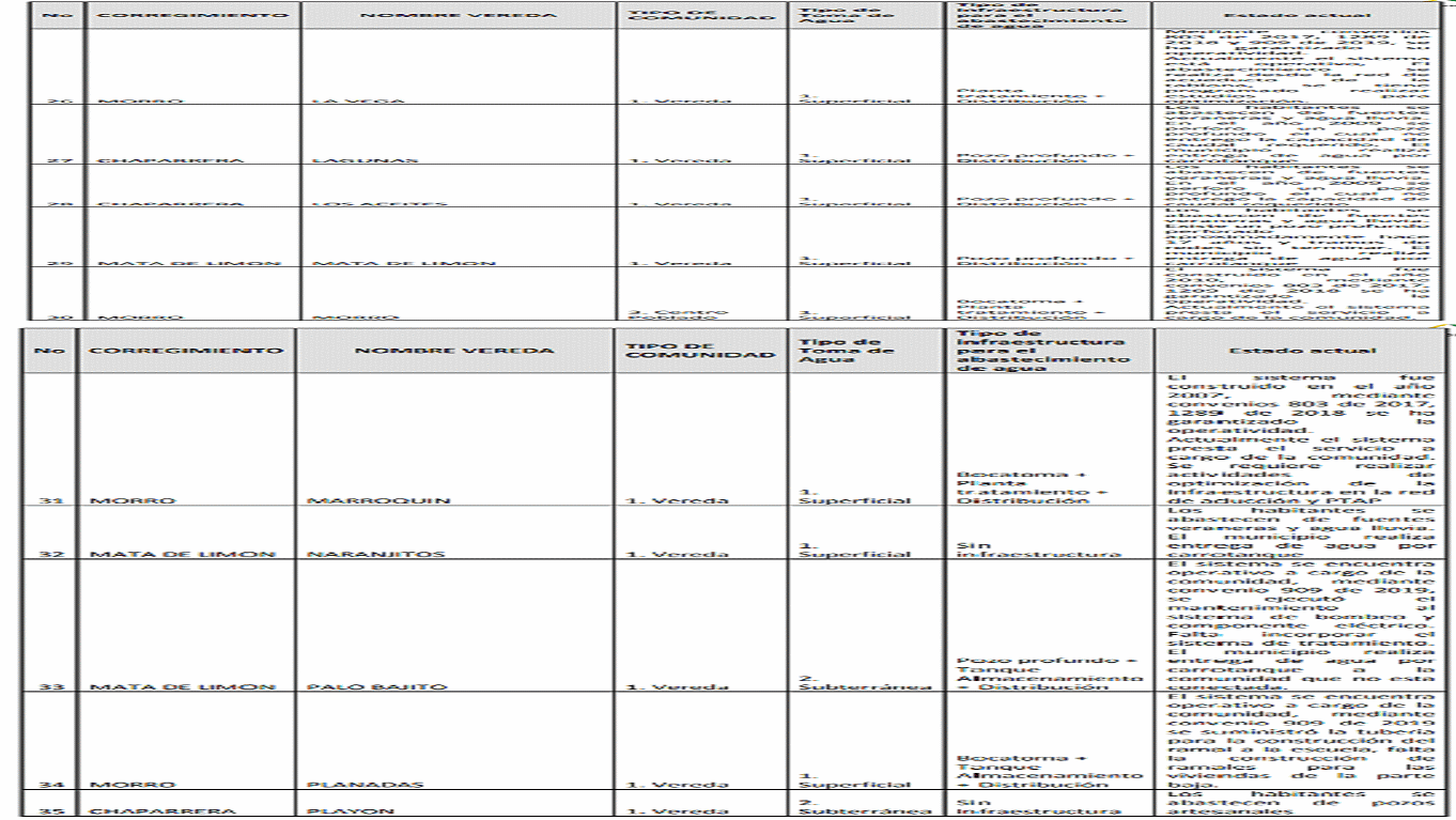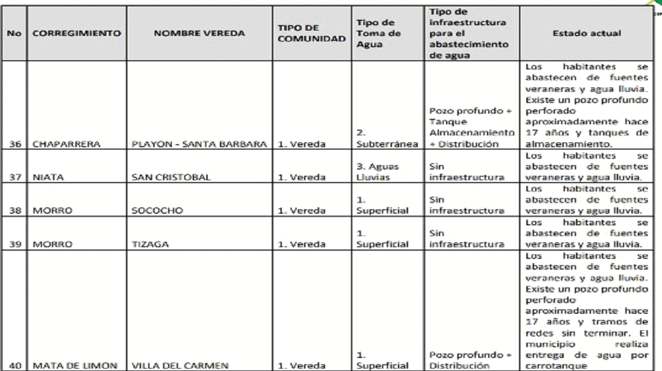 Afirmaron que en el año 2013, junto con varios líderes comunales, solicitaron al anotado ente territorial y al Departamento de Casanare, la construcción de un macro acueducto que beneficiaría a las Veredas Tizaga, Sococho, Aracal, Floreña, Naranjito, Mata de Limón, Palo Bajito, Villa del Carmen, La Resera, La Ñiata, Lagunas, Los Aceites, Playón Santa Bárbara, Araguaney, El Bajo, Brisas del Oriente, La Patimena y el casco urbano de La Chaparrera, que hacen parte de los corregimientos Morro, Mata de Limón, La Ñiata y Chaparrera. Sin embargo, estas entidades se negaron alegando falta de disponibilidad presupuestaria para brindar ese servicio en esas zonas.