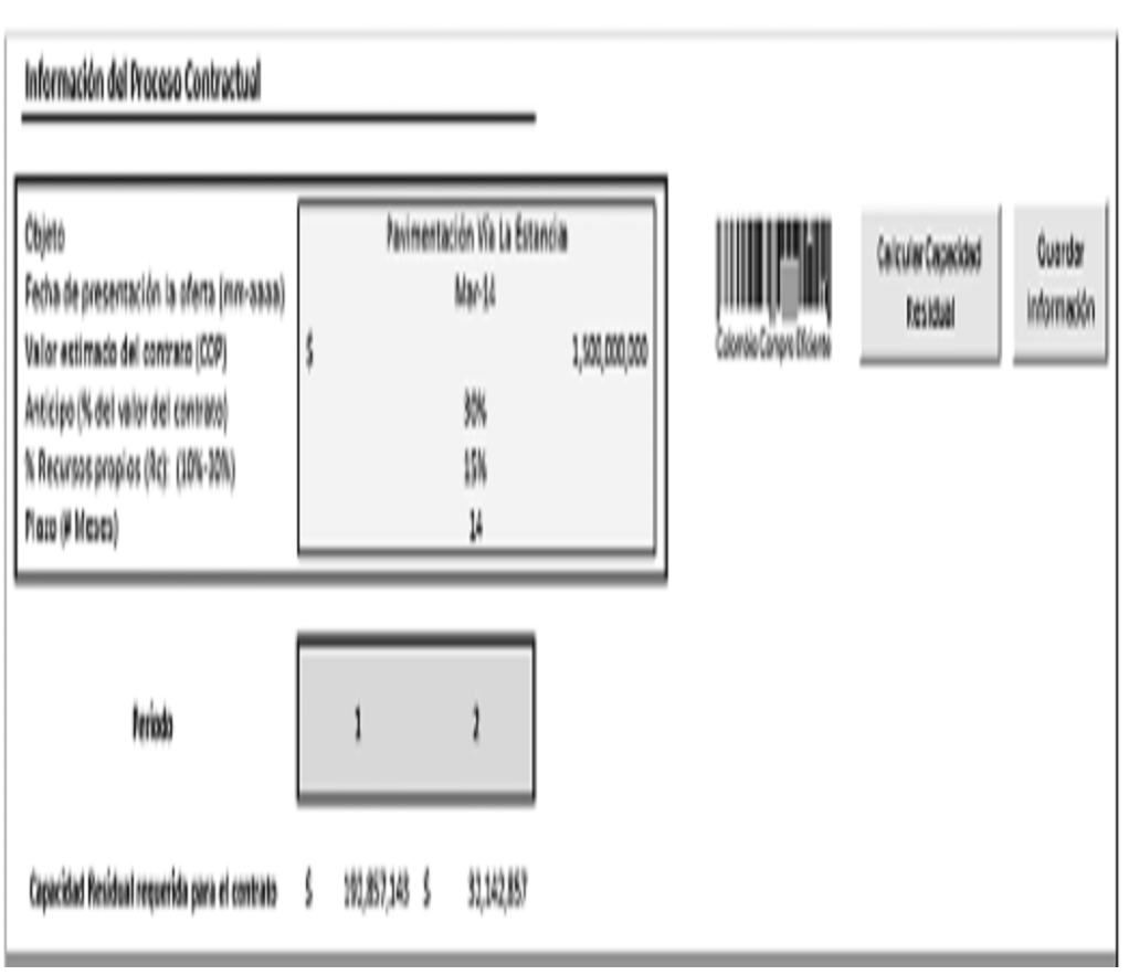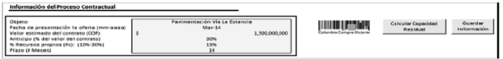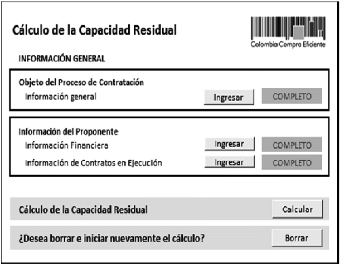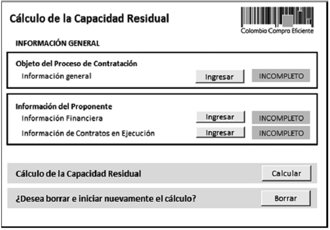 Colombia Compra Eficiente pone a disposición de los partícipes del sistema de compra y contratación pública la aplicación en Excel llamada “Capacidad Residual” para: (a) ayudar a las Entidades Estatales a establecer la Capacidad Residual en los Procesos de Contratación de obra pública; (b) ofrecer a los proponentes una herramienta para verificar si cuentan con la Capacidad Residual exigida en los Procesos de Contratación en los cuales tienen interés y para acreditar esta en tales procesos; y (c) ofrecer a las Entidades Estatales una herramienta para verificar la información presentada por los proponentes para acreditar la Capacidad Residual.
