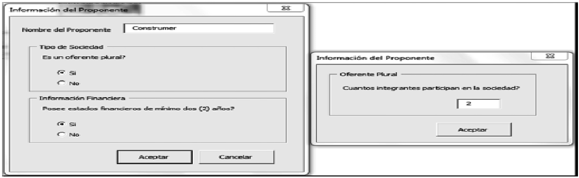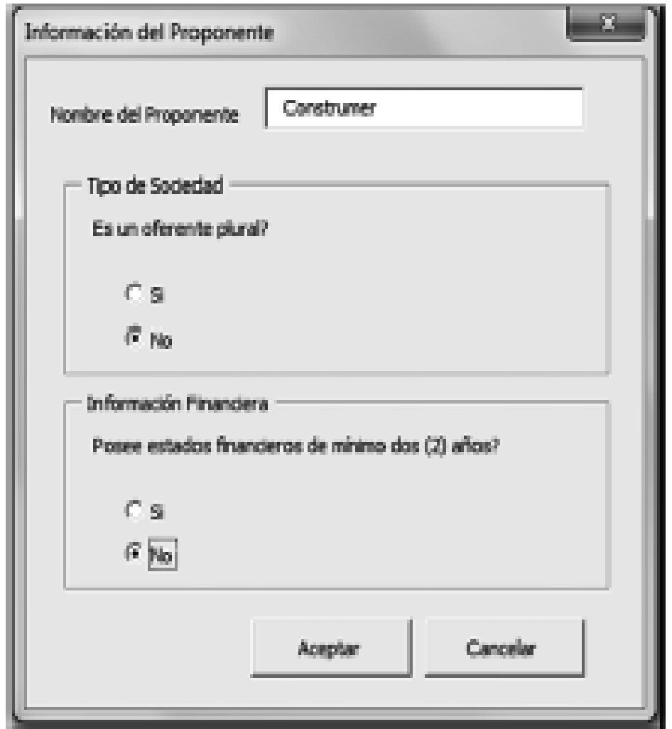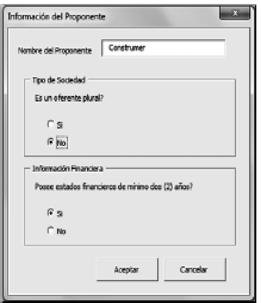 Información Financiera: Este botón presenta un formulario en el que se especifica: (i) el nombre del proponente; (ii) indicación de si es una persona natural o jurídica; (iii) si el proponente es persona jurídica el tipo de sociedad; (iv) indicación de si el proponente es plural; y (v) indicación de si el oferente tiene menos de dos (2) años de existencia o de ejercicio profesional.