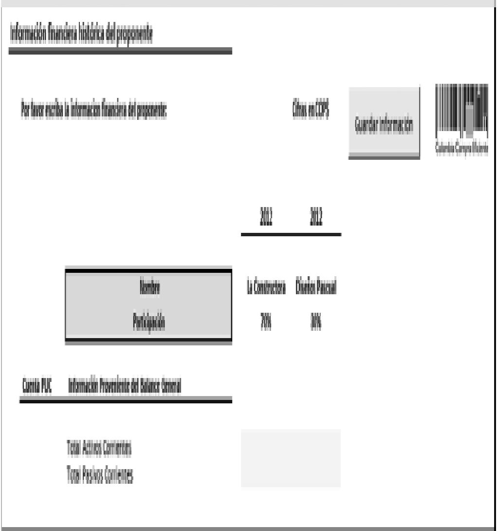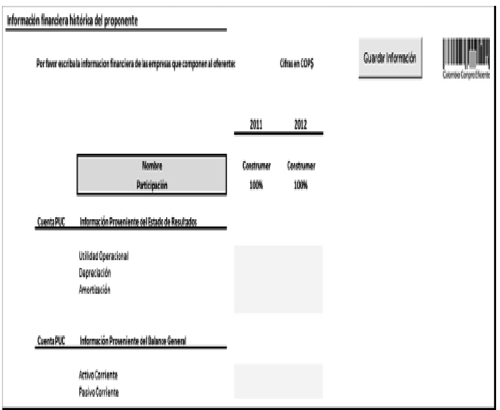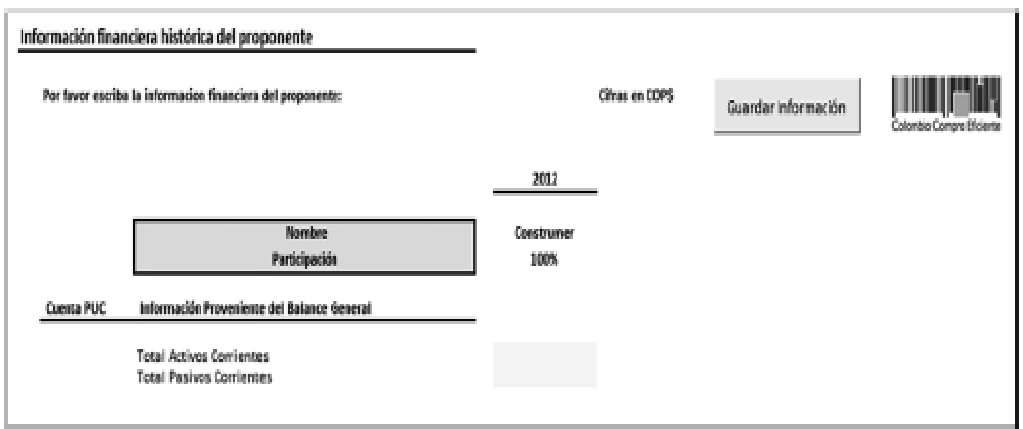 El proponente debe ingresar la información financiera relacionada con los estados financieros del último año. En este caso solamente debe ingresar el total de activo corriente y pasivo corriente: